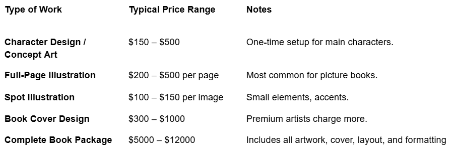- Detailed, textured, or watercolor illustrations – $150–$250 per page